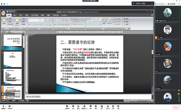 6月23日上午,在端午节假期期间,我院以线上方式召开2023年招生宣传工作组会议,院领导班子、全体招生宣传工作组成员参加会议。